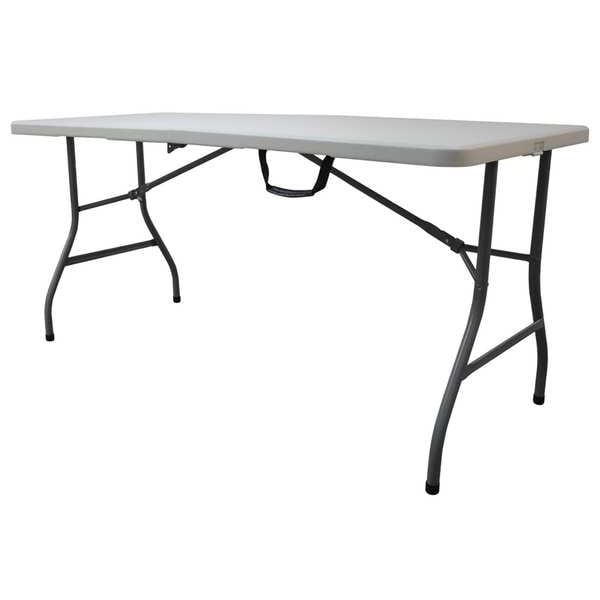 Folding Table, Surface Material Blow Molded Polyethylene, Rectangle, Width 30 in, Length 61 in, Height 29 in, Tabletop Color Family White, Tabletop Color White, Frame Color Gray, Assembled/Unassembled Assembled, Frame Material Steel, Edge Color White, Edge Type Bullnose, Leg Type Wishbone, Table Material Blow Molded Polyethylene, Top Thickness 1 1/2 in, Load Rating 600 lb, Standards Not Applicable, Includes Not Applicable