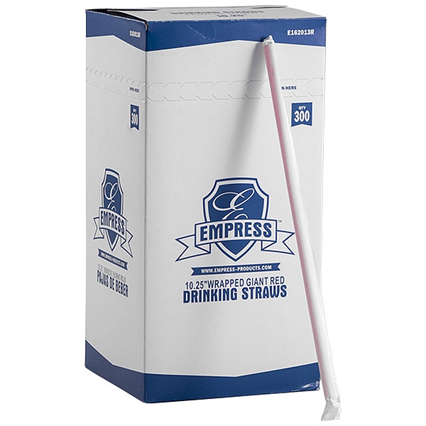 Disposable Straw, Bendable No, Bio-Based Yes, BPI Certified No, Compostable Commercially Compostable, FSC Certified No, Disposable Utensil Type Giant Straw, Recyclable Yes, SFI Certified No, Standards Not Applicable, Tip Straight, USDA Certified Bio-based Products No, Color Red, Length 10 1/4 in, Material Plastic, Pack Count 300, Wrapped or Unwrapped Wrapped, Package Quantity 1200