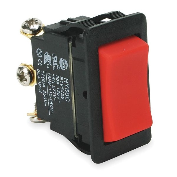 Rocker Switch, Contact Form SPDT, Number of Connections 3, Switch Function On/On, Terminals Screw, Mounting Hole 0.830 in x 1.450 in, AC Contact Rating 15A @ 250V, 20A @ 125V, HP 1 1/2 hp, Body Color Black, Switch Color Red, Operating Temp. Range 32 Degrees to 104 Degrees F, Standards CE, CUL, TUV, UL Listed