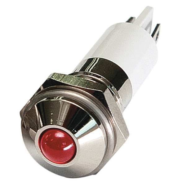 Raised Panel Light, LED, Brass Plated Chrome, LED, Plastic (ABS), Red, Voltage 24V DC, Size 10mm Mounting dia, Electrical Connection 0.11 Male Quick Disconnect, Shape Round, Current Drawn 20 mA, Average Life 100,000 hr, IP Rating IP40, Panel Thickness Up to 0.160 in, Standards cRUus, RoHS
