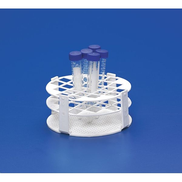 Circular, high-impact plastic rack features 24 positions to hold tubes up to 20mm in diameter. Perforated bottom assists with drainage. Rack measures 145mm in diameter and 70mm tall.