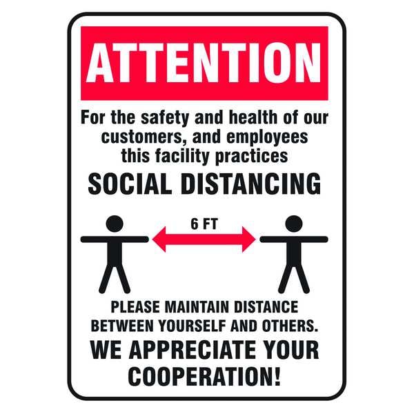 Safety Sign, Sign Subject Matter Social Distancing, Height 14 in, Width 10 in, Sign Material Plastic, Header Attention, Legend For The Safety And Health Of Our Customers And Employees This Facility Practices Social Distancing 6 Ft. Please Maintain Distance Between Yourself And Others. We Appreciate Your Cooperation!, Printed Language English