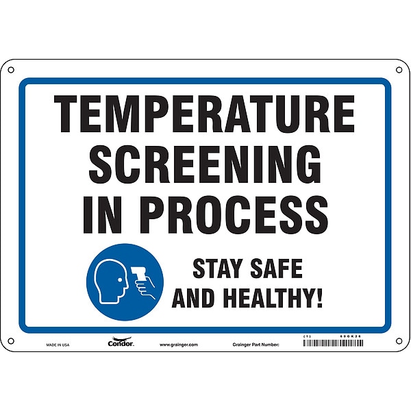 Safety Sign, Height 10 in, Width 14 in, Sign Material Plastic, Header No Header, Legend Temperature Screening In Process Stay Safe And Healthy!, Printed Language English