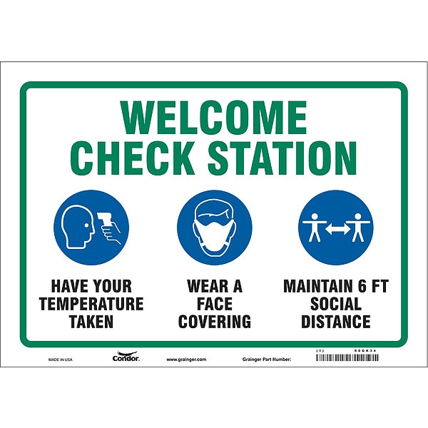 Safety Sign, Height 10 in, Width 14 in, Sign Material Vinyl, Header No Header, Legend Welcome Check Station Have Your Temperature Taken Wear A Face Covering Maintain 6 Ft Social Distance, Printed Language English