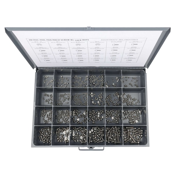 Fastener Assortment, Finish Plain, Head Type Pan, Drive Phillips, Number of Sizes 24, Number of Pieces 600, Material Stainless Steel, Pack Size Small, System of Measurement Metric, Container Material Metal, Head Style Pan, Hex Nuts Included (25) M3-0.5