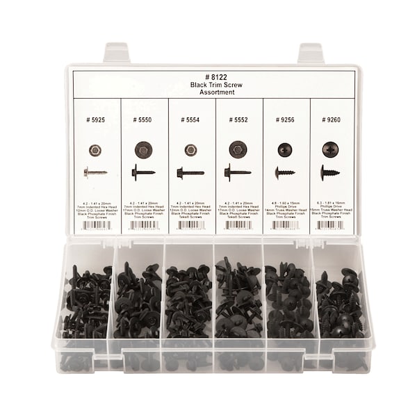 Screw Assortment, Finish Black Finish, Head Type Hex, Drive External Hex, Phillips, Number of Sizes 6, Number of Pieces 210, Material Steel, Pack Size Small, System of Measurement Metric, Dimensional Standards Not Applicable, Thread Type Not Applicable, Container Length 11 in, Container Material Plastic, Container Width 6 3/4 in, Head Style Hex, Hex Head Screws Included (4) 4.2-1.41 x 20 mm, 4.8-1.60 x 15 mm, 6.3-1.81 x 16 mm