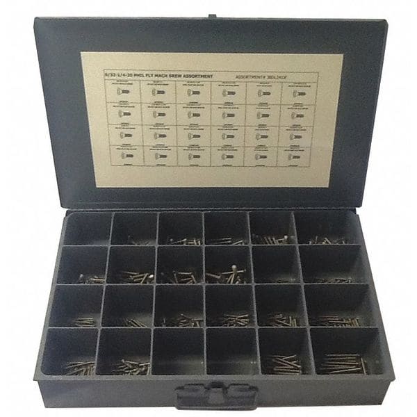 Screw Assortment, Finish Plain, Head Type Flat, Drive Phillips, Number of Sizes 24, Number of Pieces 600, Material Stainless Steel, Pack Size Small, System of Measurement Inch, Container Material Metal, Head Style Flat