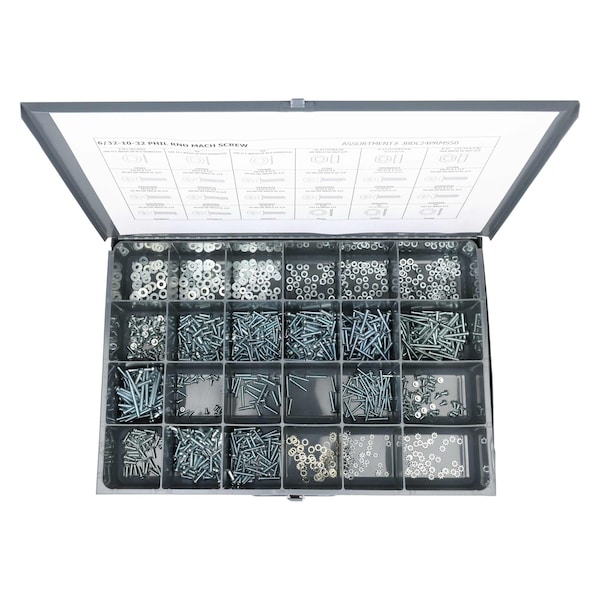 Fastener Assortment, Finish Zinc Plated, Head Type Round, Drive Phillips, Number of Sizes 24, Number of Pieces 1,200, Material Steel, Pack Size Small, System of Measurement Inch, Container Material Metal, Head Style Round, Hex Nuts Included #10-32, #6-32, #8-32