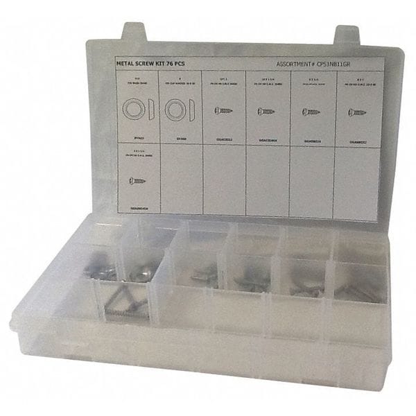Tapping Screw Assortment, Finish Plain, Head Type Oval, Drive Phillips, Number of Sizes 6, Number of Pieces 76, Material Steel, Pack Size Small, System of Measurement Inch, Container Material Plastic, Flat Washers Included (15) #8, Head Style Oval, Includes Screws (8) Each: #8 x 1 1/4 in, #10 x 1 1/4 in, (10) Each: #8 x 3/4 in, x1 in, #10 x 1 in, Washers (15) Each: #8, #10, Plastic Hanging Pak, Includes Flat Washers Flat Washers Included, Includes Hex Head Screws Hex Head Screws Not Included
