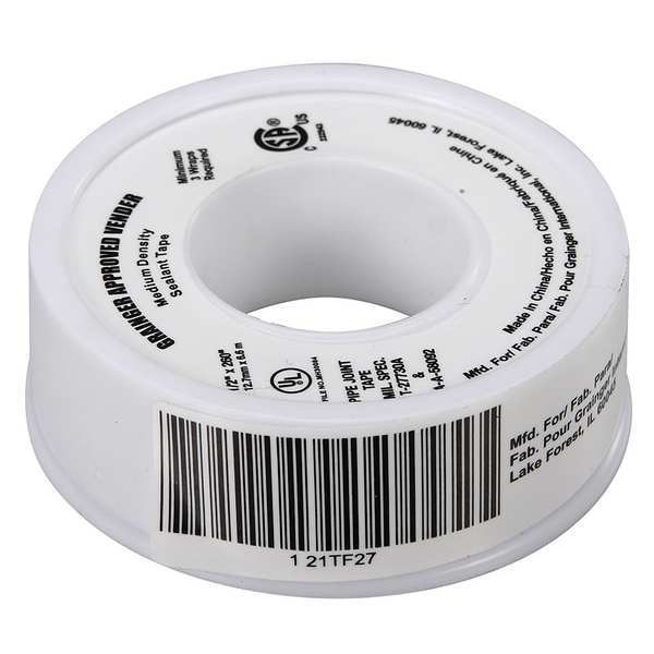 Thread Sealant Tape, Specific Sealing Application General Purpose Thread Sealing, Overall Width 1/2 in, Overall Length 21 ft, Minimum Operating Temperature -400 Degrees F, Maximum Operating Temperature 550 Degrees F, Maximum Operating Pressure for Liquids 10,000 psi, Maximum Operating Pressure for Gases 2,000 psi, Maximum Linear Density 0.8 g/cc, Minimum Linear Density 0.7 g/cc, Color White, Tape Type Pipe Thread Sealant Tape, For Maximum Thread Diameter 3/4 in, For Material Type Brass, Steel