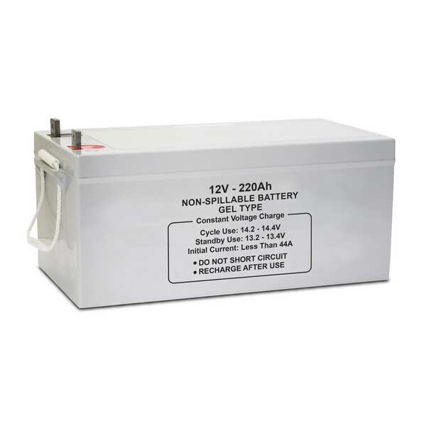 Sealed Lead Acid Battery, Battery Design GEL, Voltage - Batteries 12V DC, Capacity - Batteries 250 Ah, Terminal Type - Batteries Tab with Bolt Hole, Height 8.66 in, Width 10.55 in, Depth 20.47 in, Housing Material - Batteries ABS, Battery Cycle Type Dual Purpose, Terminal Location Top, Application General Purpose, For Use With All Purpose, Recharge Time 16 hr, Battery Chemistry Lead Acid, Rechargeable Up To 3 yr, Weight 160.94 lb, Battery Cross-Reference CP12-250.0