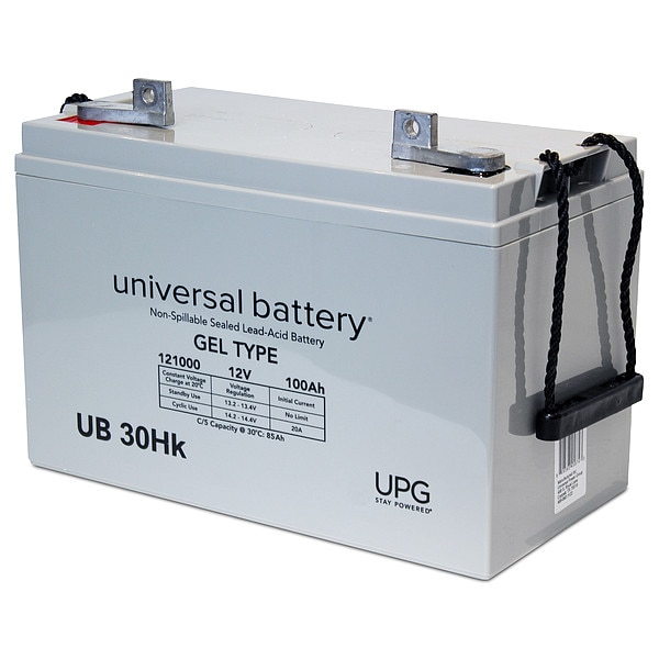 Sealed Lead Acid Battery, Battery Design GEL, Voltage - Batteries 12V DC, Capacity - Batteries 100 Ah, Terminal Type - Batteries Tab with Bolt Hole, Height 8.23 in, Width 6.81 in, Depth 12.95 in, Housing Material - Batteries ABS, Battery Cycle Type Deep Cycle, Terminal Location Top, Application Motorized Wheel Chair, For Use With All Purpose, Recharge Time 12 to 16 hr, Battery Chemistry Lead Acid, Rechargeable Up To 250 Times, Weight 68 lb, Max. Operating Temp. 104 Degrees F