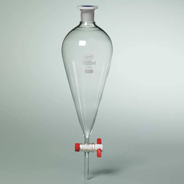 Pear-shaped borosilicate glass funnel with 1000ml capacity. Funnel features a durable marking spot and large white block letters for easy identification of capacity, as per ASTM E1096. Included PTFE stopcock is compliant with ASTM standard E675. Size 27 plastic stopper also included.