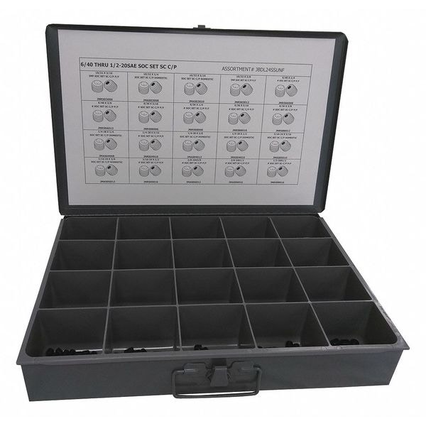 Socket Set Screw Assortment, Socket Head Cap Screw Head Type Not Applicable, Point Type Cup, Number of Pieces 500, System of Measurement Inch, Thread Size #10-32, #6-40, #8-36, 1/2 In.-20, 1/4 In.-28, 3/8 In.-24, 5/16 In.-24, Overall Length 3/16 in, 1/4 in, 5/16 in, 3/8 in, 1/2 in, Number of Sizes 20, Drive Type Phillips, Material Alloy Steel, Finish Black Oxide, Pack Size Small Pack, Special Features Not Applicable, Dimensional Standards ASME B18.3
