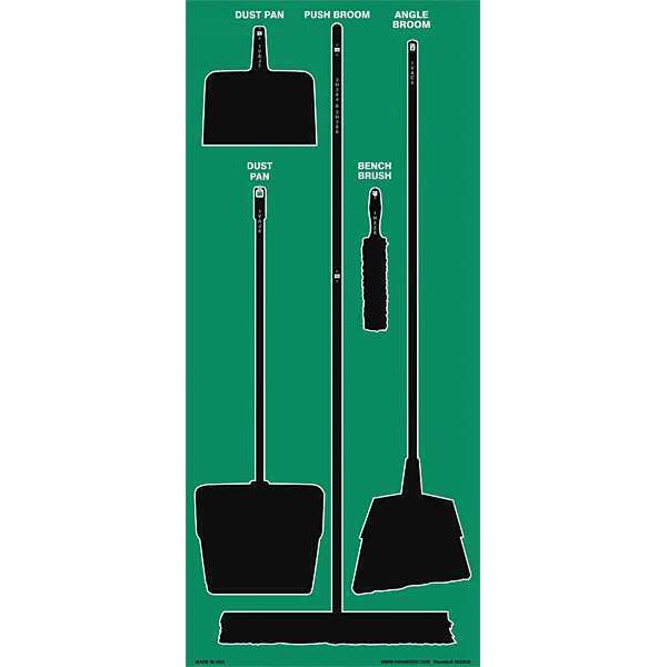 Shadow Board, Background Color Green, Board Height 68 in, Board Material Polycarbonate, Board Thickness 0.187 in, Board Width 30 in, Hardware Material Polycarbonate, Included Products Hanging Hardware, Includes Tools No, Product Type Shadow Board, Resistance Properties Abrasion-Resistant, Chemical-Resistant, Chip-Resistant, Corrosion-Resistant, Crack-Resistant, Fade-Resistant, Shadow Board Application Cleaning, Shadow Color Black