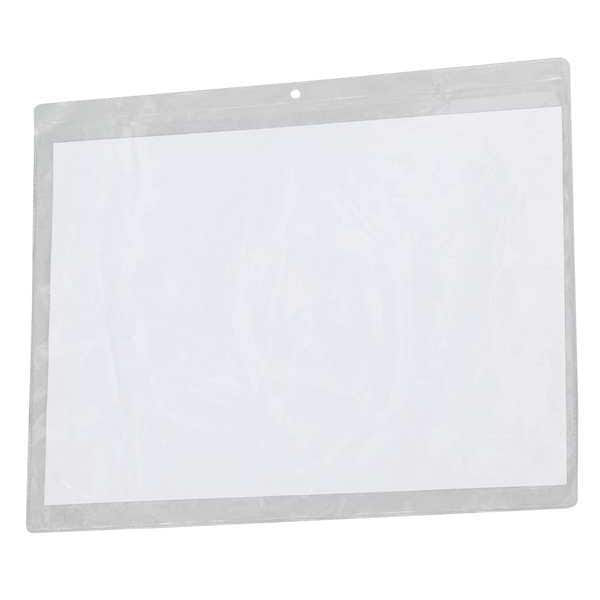 Shop Ticket Holder, Mounting Type Punched Hole, Opening Long Side, Material Vinyl, Seam Style Sonic Welded, Color Clear, Width 12 13/16 in, Height 9 7/8 in, Package Quantity 50
