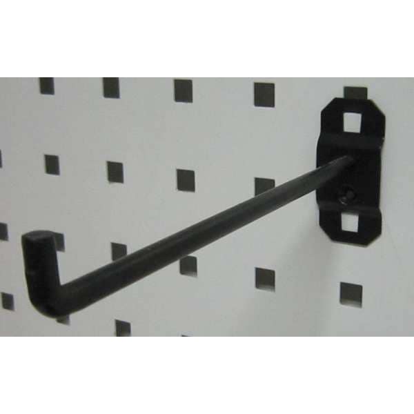 Single Rod Pegboard Hook, Overall Length 6 1/2 in, Overall Width 1 in, 1 1/2 in For Pegboard Hole Spacing, For Pegboard Hole Size 3/8 in, Surface, Screw-In Locking System, Square For Pegboard Hole Shape, Steel, Black, 90-Degree Single Hook Accessory Type, Package Quantity 5