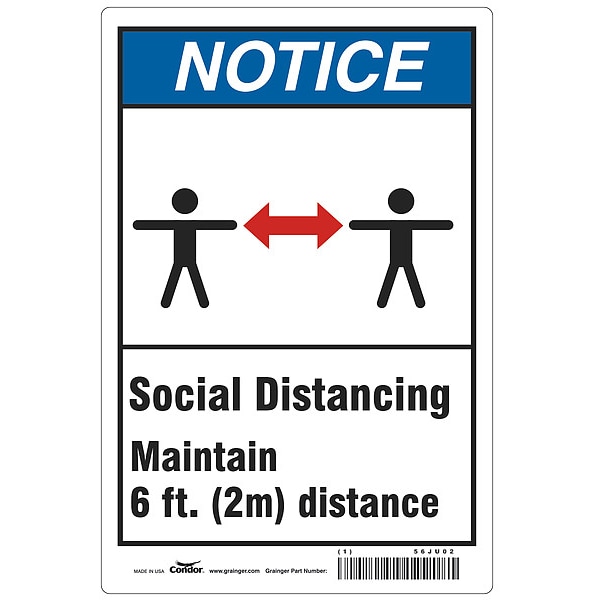 Social Distancing Sign, Sign Subject Matter Social Distancing, Height 10 in, Width 14 in, Sign Material Polyester, Sign Mounting Style Adhesive Surface, Header Notice, Legend Social Distancing Maintain About 6Ft. (2m) Distance, Printed Language English