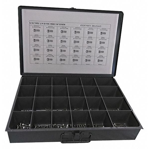 Socket Cap Screw Assortment, Socket Head Cap Screw Head Type Standard, Number of Pieces 600, System of Measurement Inch, Thread Size #10-24, #10-32, #6-32, #8-32, 1/4 In.-20, Overall Length 1/4 in, 3/8 in, 1/2 in, 5/8 in, 3/4 in, 1 in, Number of Sizes 24, Drive Type Socket, Material Stainless Steel, Material Grade/Class 18-8, Finish Plain, Pack Size Small Pack, Special Features Not Applicable, Dimensional Standards ASME B18.3