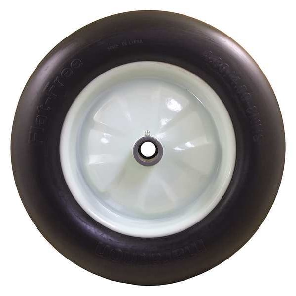 Flat-Free Wheel, 425 lb Load Rating, Smooth Tread, 15 1/2 in Wheel Dia., 4 in Wheel Width, For Axle Size 1 in, 4.80/4.00-8, Standard Tire Rim Type, Center Mount Hub Position, 6 in Hub Length, Steel Hub Material, Yes Non-Marking