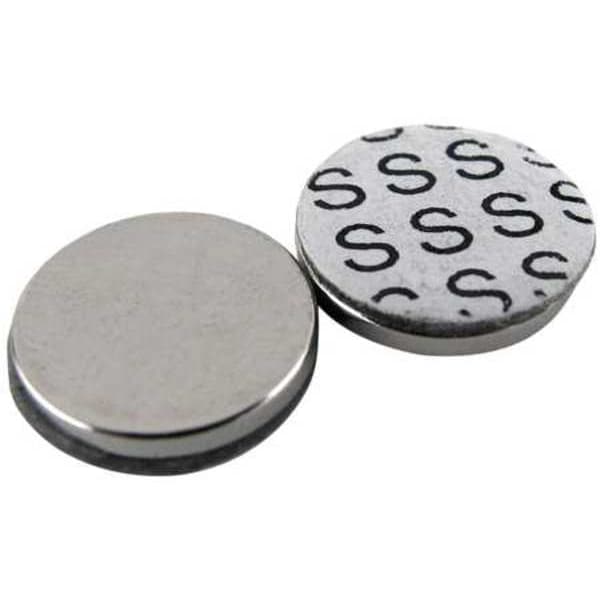 Disc Magnet, South, Thickness (In.) 1/16, Dia. (In.) 1/4, Max. Pull (Lb.) 1, Grade 35 Neodymium Magnet With Acrylic Foam Adhesive, Paper Liner, Silver, Dark Grey, 24 hr. Cure Time, Magnetic Pole Printed on Liner, Package Quantity 10