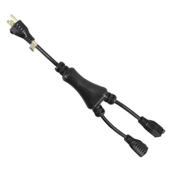 Wye Splitter Power Cord, Wire Size 16 AWG, Number of Conductors 3, Jacket Material PVC, Jacket Color Black, Connection Type (2) NEMA 5-15R, Cord Length 1 1/4 ft, Voltage 125V AC, Plug Configuration NEMA 5-15P, Max. Amps 13 A, Cord Shape Round, Temp. Rating -4 Degrees to 221 Degrees F, Trade Designation SJT