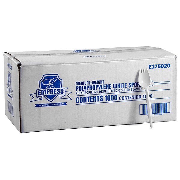 Disposable Spork, Bio-Based No, BPI Certified No, Color White, Compatible Manufacturer Dispenser Part Number Not Applicable, Compostable Not Compostable, Letter Series E175, Material Plastic, Product Series Not Applicable, Product Type Spork, Recyclable No, SFI Certified No, Specific Material Polypropylene, Standards FDA Approved, USDA Certified Bio-based Products No, Weight Medium-Weight, Wrapped or Unwrapped Unwrapped, Compatible Grainger Dispenser Part Number Not Applicable, FSC Certified No