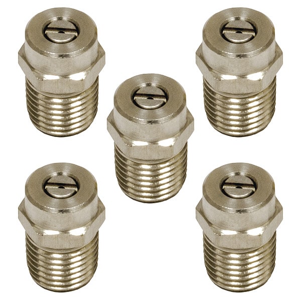 Pressure Washer Spray Nozzle, Nozzle Size 8, Max. Pressure 5,000 psi, Inlet 1/4 in (M)NPT, Material Stainless Steel, Nozzle Spray Angle 15 Degrees , GPM @ 800 PSI 3.58 gpm, GPM @ 1000 PSI 4 gpm, GPM @ 1500 PSI 4.9 gpm, GPM @ 2000 PSI 5.66 gpm, GPM @ 2500 PSI 6.32 gpm, GPM @ 3000 PSI 6.93 gpm, GPM @ 3500 PSI 7.48 gpm, GPM @ 4000 PSI 8 gpm, GPM @ 5000 PSI 8.94 gpm, Includes (5) Identical Nozzles, Package Quantity 5