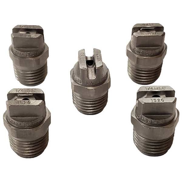 Pressure Washer Spray Nozzle, Nozzle Size 20, Max. Pressure 5,000 psi, Max. Fluid Temp. 200 Degrees F, Inlet 1/4 in (M)NPT, Material Stainless Steel, Orifice Size 2.77 mm, Nozzle Spray Angle 15 Degrees , GPM @ 800 PSI 8.94 gpm, GPM @ 1000 PSI 10 gpm, GPM @ 1500 PSI 12.25 gpm, GPM @ 2000 PSI 14.14 gpm, GPM @ 2500 PSI 15.81 gpm, GPM @ 3000 PSI 17.32 gpm, GPM @ 3500 PSI 18.71 gpm, GPM @ 4000 PSI 20 gpm, GPM @ 5000 PSI 22.36 gpm, Package Quantity 5