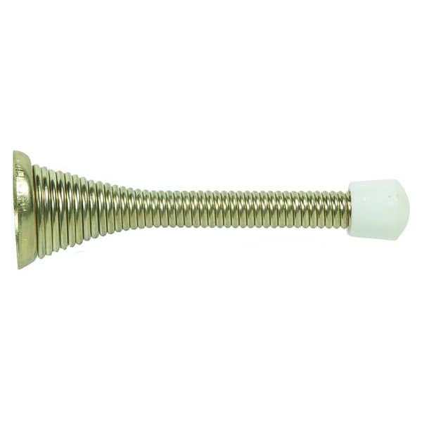 Spring Door Stop, Mounting Type Screw In, Finish Brass, Color Gold, Base Dia. 1 in, Projection 3 in, Length 3 in, Height 15/16 in, Width 1 in, Mounting Style Screw-In, Material Steel, Hardware Not Included