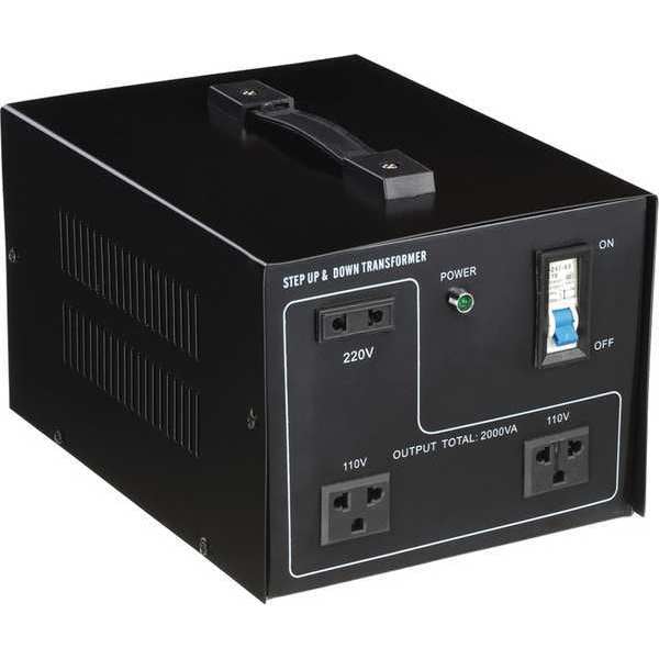 Step Up/Step Down Voltage Converter, Converts 110 to 220V AC, 220 to 110V AC, VA Rating 1.5kVA, 50/60 Hz, Phase Single, 80 Degrees C Temp. Rise, Mounting Portable, Enclosure Material Steel, Height 5.9 in, Depth 9.8 in, Width 7.5 in, Standards CE, Includes (3) Outlets, 6A Circuit Breaker
