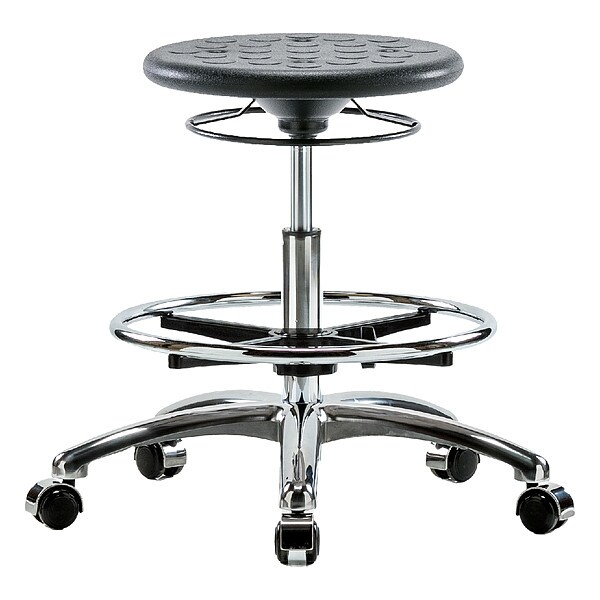 Stool, Weight Capacity 300 lb, Seat Height Range 19 1/4 in to 27 in, Seat Depth 13 in, Seat Width 13 in, Color Black, Material Polyurethane, Base Polished Cast Aluminum, Features 360 Degrees Control, Dual Wheel, Non-Marring Casters, Soil and Puncture Resistant, Includes Not Applicable, Standards ANSI/BIFMA, CAL 117