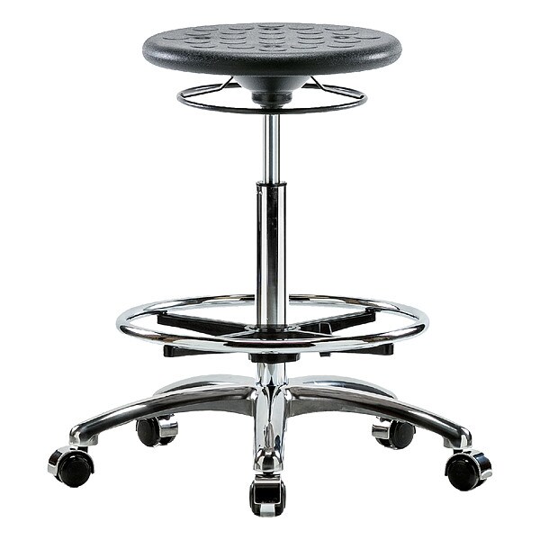 Stool, Weight Capacity 300 lb, Seat Height Range 23 1/2 in to 33 1/2 in, Seat Depth 13 in, Seat Width 13 in, Color Black, Material Polyurethane, Base Polished Cast Aluminum, Features 360 Degrees Control, Dual Wheel, Non-Marring Casters, Self-Braking, Soil and Puncture Resistant, Includes Not Applicable, Standards ANSI/BIFMA, CAL 117