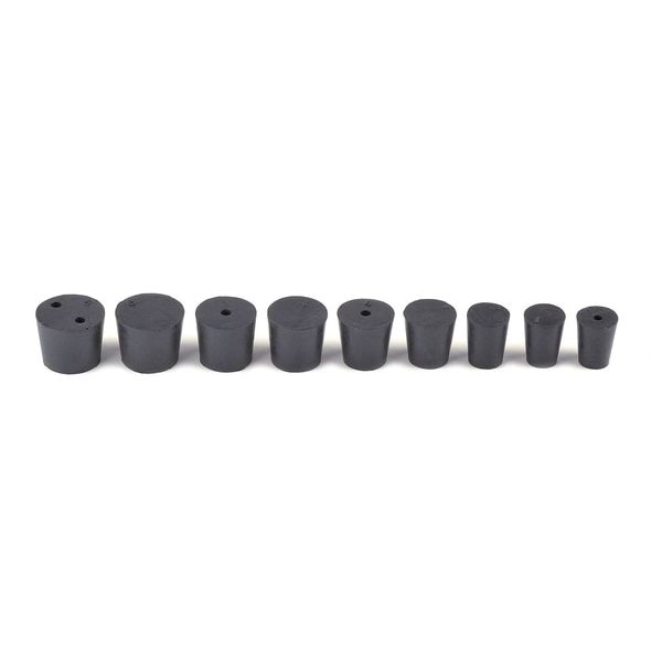 One-pound bag of assorted black rubber stoppers, sizes 1 to 6. Made of natural rubber that stays pliable over a long period of time. Ideal for use with non-aggressive or concentrated solutions. Low sulfur content. Will withstand temperatures from –25°C to 70°C (–13°F to 158°F).