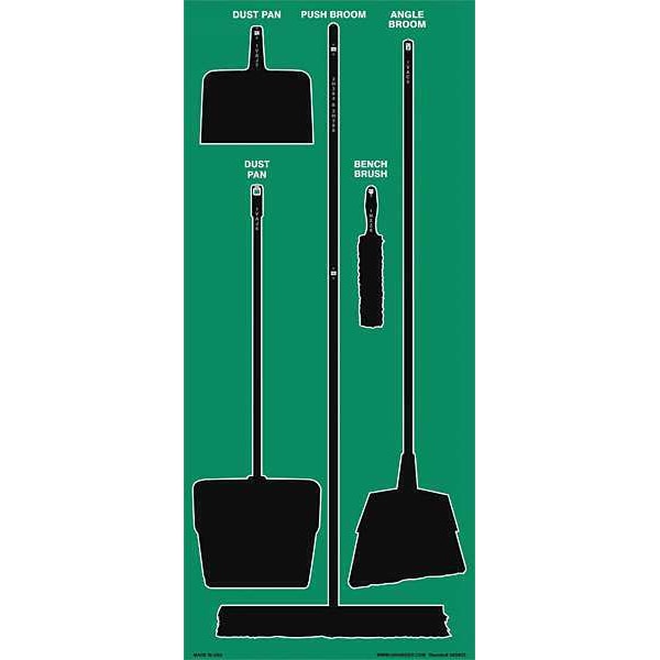 Shadow Board, Background Color Green, Board Height 68 in, Board Material Aluminum Composite, Board Thickness 0.236 in, Board Width 30 in, Hardware Material Aluminum Composite, Included Products Hanging Hardware, Includes Tools No, Product Type Shadow Board, Resistance Properties Anti-Static, Corrosion-Resistant, UV-Resistant, Shadow Board Application Cleaning, Shadow Color Black, Shadow Shapes Included Angle Broom, Bench/Counter Brush, Handheld Dust Pan, Long Handled Dust Pan, Push Broom