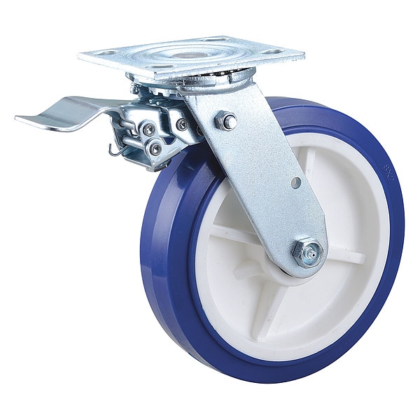 Swivel, Plate Caster, Load Rating 900 lb, Swivel Lock Type Total Lock, Wheel Dia. 8 in, Wheel Width 2 in, Wheel/Tread Material Polyurethane, Wheel Core Material Polyolefin, Non-Marking Yes, Number of Wheels 1, Caster Brake Type Total Lock, Tread Shape Standard