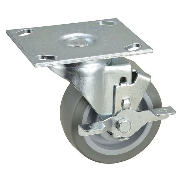 Swivel, Plate Caster, Load Rating 275 lb, Swivel Lock Type No Lock Included, Wheel Dia. 4 in, Wheel Width 1 1/2 in, Wheel/Tread Material Rubber, Wheel Core Material Polyolefin, Non-Marking Yes, Number of Wheels 1, Caster Brake Type Side Brake, Tread Shape Standard