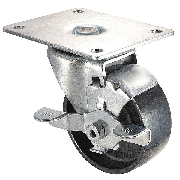 Swivel, Plate Caster, Load Rating 250 lb, Swivel Lock Type No Lock Included, Wheel Dia. 3 in, Wheel Width 1 1/4 in, Wheel/Tread Material Iron, Wheel Core Material Iron, Non-Marking Yes, Number of Wheels 1, Caster Brake Type Side Brake, Tread Shape Standard