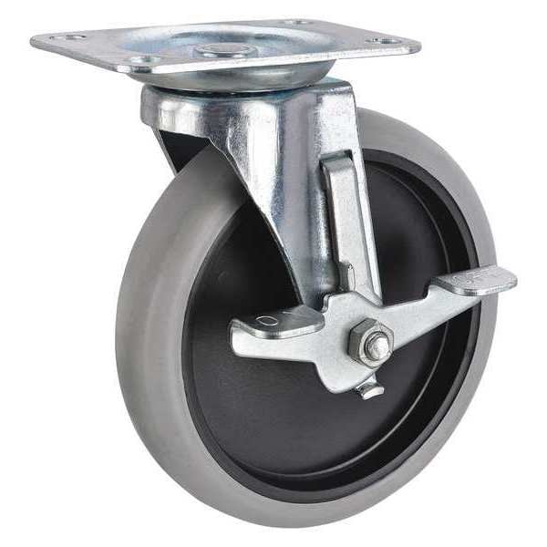 Swivel, Plate Caster, Load Rating 145 lb, Swivel Lock Type No Lock Included, Wheel Dia. 5 in, Wheel Width 1 1/4 in, Wheel/Tread Material Rubber, Wheel Core Material Polyolefin, Non-Marking Yes, Number of Wheels 1, Caster Brake Type Side Brake, Tread Shape Standard