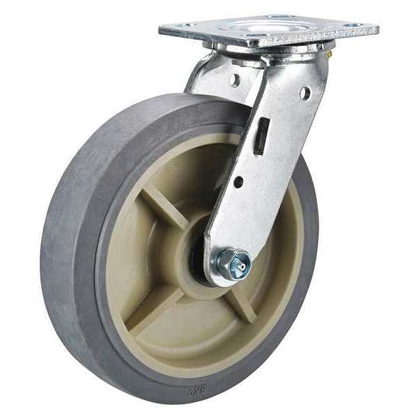 Swivel, Plate Caster, Load Rating 600 lb, Swivel Lock Type No Lock Included, Wheel Dia. 8 in, Wheel Width 2 in, Wheel/Tread Material Rubber, Wheel Core Material Polyolefin, Non-Marking Yes, Number of Wheels 1, Caster Brake Type No Brake, Tread Shape Standard
