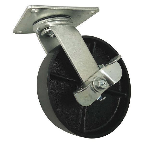 Swivel, Plate Caster, Load Rating 1200 lb, Swivel Lock Type No Lock Included, Wheel Dia. 8 in, Wheel Width 2 in, Wheel/Tread Material Iron, Wheel Core Material Iron, Non-Marking Yes, Number of Wheels 1, Caster Brake Type Side Brake, Tread Shape Standard