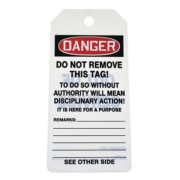 Tag, Compatible Tag Holder Mfr Part Number Not Applicable, Compatible Tag Insert Mfr Part Number Not Applicable, Fastener Attachment Length Not Applicable, Fastener Type Not Applicable, Header Wording (Reverse Side) Danger, Header Wording Danger, Height 6 1/4 in, Indoor/Outdoor Usage Indoor/Outdoor, Lamination Type Not Laminated, Language English, Mounting Hole Reinforcement Type No Grommet, Mounting Hole Size 3/8 in, Number of Tags 100, Preprinted Images (Reverse Side) Not Applicable