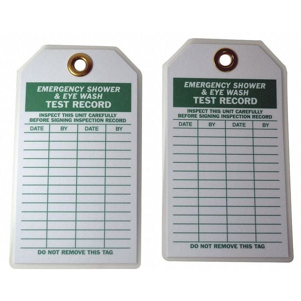 Tag, Emergency Shower & Eye Wash Test, Polyester, 7 in H x 4 in W, White, Rectangle, 10 PK