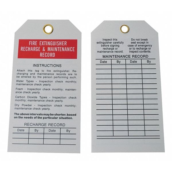 Tag, Fire Extinguisher, PVC, 5 3/4 in H x 2 7/8 in W, White, Rectangle, 25 PK
