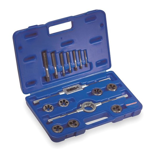 Tap and Die Set, Number of Pieces 16, Die Shape Round, Tap Type Hand, Die Material High Speed Steel, Thread Sizes Included 1/2 In.-13, 1/4 In.-20, 3/4 In.-10, 3/8 In.-16, 5/16 In.-18, 5/8 In.-11, 7/16 In.-14, Die Thread Sizes Included 1/2 In.-13, 1/4 In.-20, 3/4 In.-10, 3/8 In.-16, 5/16 In.-18, 5/8 In.-11, 7/16 In.-14, Number Of Taps 7, Thread Standard UNC, Tap Shank Standard ANSI