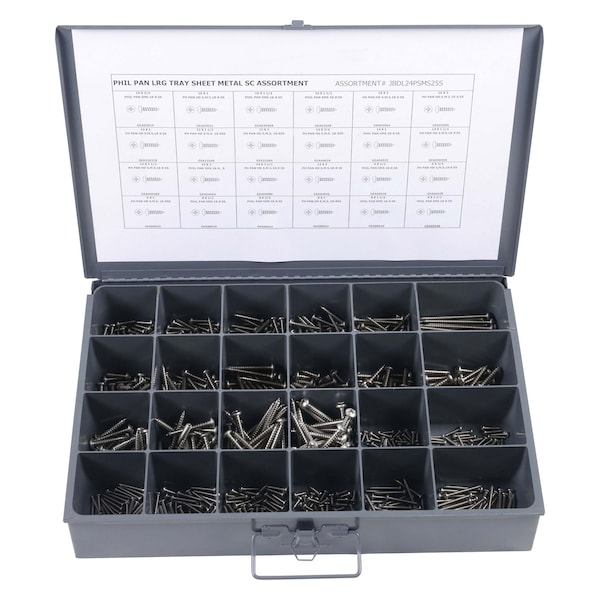 Tapping Screw Assortment, Finish Plain, Head Type Pan, Drive Phillips, Number of Sizes 24, Number of Pieces 600, Material Stainless Steel, Pack Size Small, System of Measurement Inch, Container Material Metal, Head Style Pan, Includes Screws (25) Each: #6x1/2 in, 3/4 in, 1 in, #8x1/2 in, 3/4 in, 1 in, 1 1/4 in, 1 1/2 in, #10x3/4 in, 1 in, 1 1/4 in, 1 1/2 in, 2 in, 3 in, #12x1 in, 1 1/2 in, 2 in, #14x3/4 in, 1 in, 1 1/4 in, 1 1/2 in, 2 in, 2 1/2 in, 3 in, Metal Compartment Box with Lid