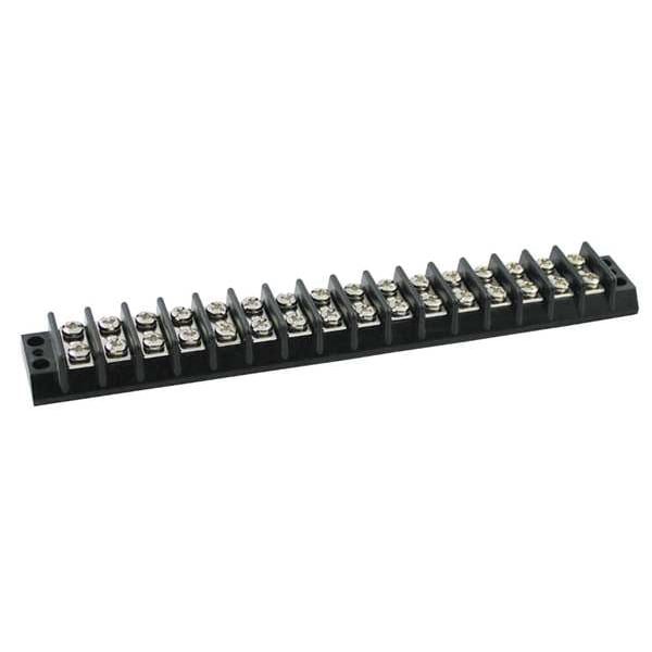Barrier Terminal Strip, Barrier Style Not Applicable, Center Spacing 7/16 in, Current 20 A, For Minimum Wire Size 22 AWG, For Maximum Wire Size 12 AWG, Maximum Voltage 300 V, Number of Poles 16, Number of Rows 2, Overall Height 0.59 in, Overall Length 7.8 in, Overall Width 1.12 in, Compatible Manufacturer Model Number Not Applicable, Compatible with Product Type Power Distribution Blocks, Cover Included No, Housing Color Black, Housing Material Phenolic, Includes Not Applicable