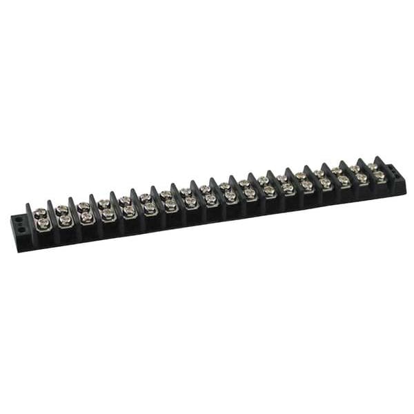 Barrier Terminal Strip, Barrier Style Not Applicable, Center Spacing 3/8 in, Current 15 A, For Minimum Wire Size 22 AWG, For Maximum Wire Size 14 AWG, Maximum Voltage 300 V, Number of Poles 18, Number of Rows 2, Overall Height 0.45 in, Overall Length 7.42 in, Overall Width 0.89 in, Compatible Manufacturer Model Number Not Applicable, Compatible with Product Type Power Distribution Blocks, Cover Included No, Housing Color Black, Housing Material Phenolic, Includes Not Applicable