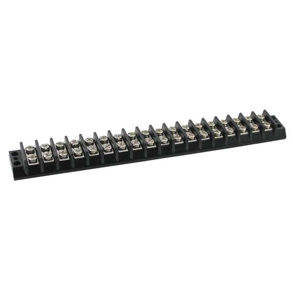 Barrier Terminal Strip, Barrier Style Not Applicable, Center Spacing 7/16 in, Current 20 A, For Minimum Wire Size 22 AWG, For Maximum Wire Size 12 AWG, Maximum Voltage 300 V, Number of Poles 18, Number of Rows 2, Overall Height 0.59 in, Overall Length 8.68 in, Overall Width 1.12 in, Compatible Manufacturer Model Number Not Applicable, Compatible with Product Type Power Distribution Blocks, Cover Included No, Housing Color Black, Housing Material Phenolic, Includes Not Applicable