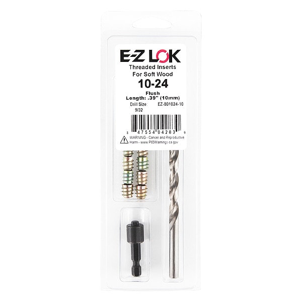 Thread Repair Kit, Number of Inserts 10, Number of Pieces 12, Insert Diameter 27/64 in, Insert Length 25/64 in, Thread Direction Right Hand, Thread Type Coarse, Insert Material Zinc, Material Grade/Class Not Applicable, Compatible Material Wood, Drill Bit Sizes Included 9/32 in, Maximum Hole Diameter 0.281 in, System of Measurement Inch, Includes (10) Flush 10-24 Inserts, 9/32 Drill, Installation Tool, Number of Sizes 1, Tap Sizes Included Not Applicable